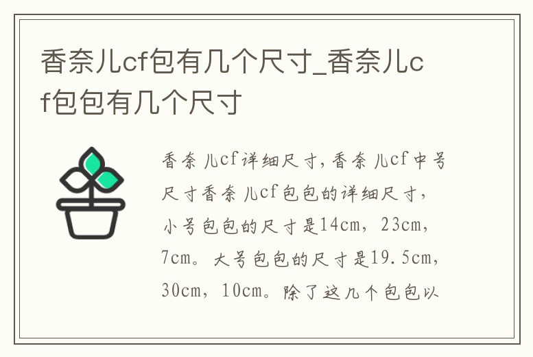 香奈兒cf包包的詳細尺寸,小號包包的尺寸是14cm,23cm,7cm。大號包包的尺寸是19.5cm,30cm,10cm。除了這幾個包包以外還有正方形、迷你型長方形、10cm以及超大號這些個尺寸。香奈兒cf中號包包的尺寸是16cm、26cm、7cm。包包。