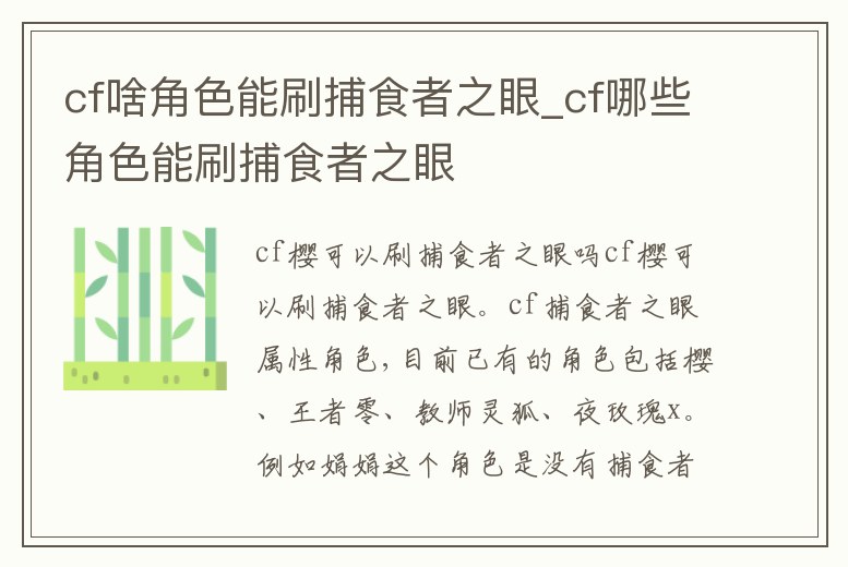 cf櫻可以刷捕食者之眼。cf捕食者之眼屬性角色,目前已有的角色包括櫻、王者零、教師靈狐、夜玫瑰x。 例如娟娟這個角色是沒有捕食者之眼這個屬性的。任何后面有X的角色都可以刷捕食者。