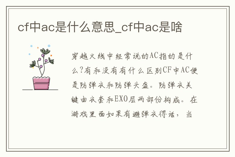 穿越火線中經常說的AC指的是什么?有和沒有有什么區別CF中AC便是防彈衣和防彈頭盔。防彈衣關鍵由衣套和EXO層兩部份構成。在游戲里面如果有避彈衣得話,當被高爆手雷炸中的過程中還能夠剩余75的血,要是沒有防彈衣會被立即炸飛。防彈頭盔是能吸取和損耗子彈的動能、阻攔透過