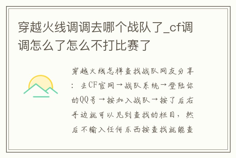 網友分享:去CF官網→戰隊系統→登陸你的QQ號→按加入戰隊→按了后右手邊就可以見到查找的欄目,然后不輸入任何東西按查找就能查找戰隊 。