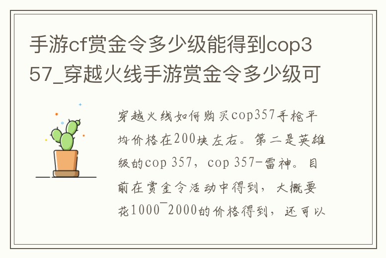 手游cf賞金令多少級能得到cop357_穿越火線手游賞金令多少級可以拿到cop