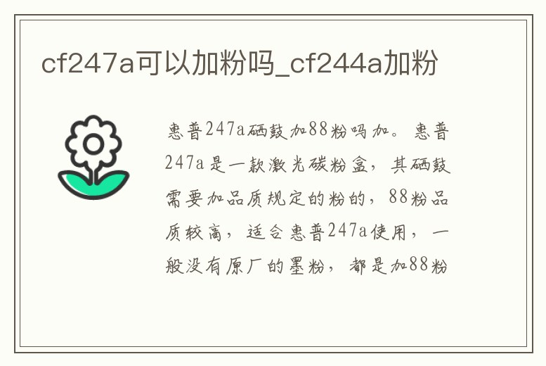 惠普247a硒鼓加88粉嗎加。惠普247a是一款激光碳粉盒,其硒鼓需要加品質規定的粉的,88粉品質較高,適合惠普247a使用,一般沒有原廠的墨粉,都是加88粉的。2、CF247A碳粉能加HP1005打印機嗎<strong>不能。</strong><br>HP1005有兩款,一款是打印機,還有一款是一體機,打印機用HP1010粉,一體機用1007/1008的粉。<br>惠普100