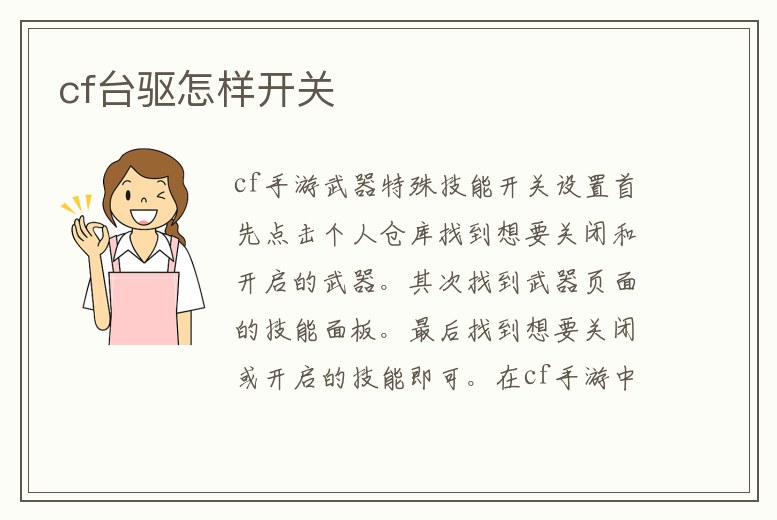 首先點擊個人倉庫找到想要關閉和開啟的武器。其次找到武器頁面的技能面板。最后找到想要關閉或開啟的技能即可。在cf手游中玩家可以根據自己的喜好開啟或關閉武器的特殊技能,《穿越火線:槍戰王者》手游與《穿越火線》端。