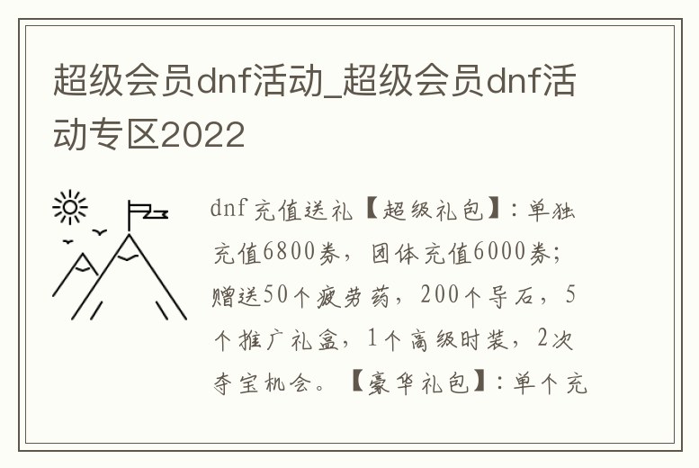 dnf開會員送黑鉆參與活動就可以免費獲得深淵票、黑鉆、超級會員等獎勵。首次創建新角色的玩家,可以領取一份【新手禮包】,禮包有:黑鉆7天*遠古精靈秘藥*霸王契約3天*星星*1。連續登陸游戲還有各種獎勵可以拿,只要。