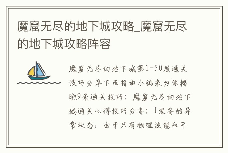 下面將由小編來為你揭曉9條通關技巧:魔窟無盡的地下城通關心得技巧分享:1裝備的異常狀態,由于只有物理技能和平砍能附加,所以是由物理職業來穿2盜賊的高速度+裝備提供的100%+封魔,可以讓所有BOSS以及BOSS左右的惡心小怪變。