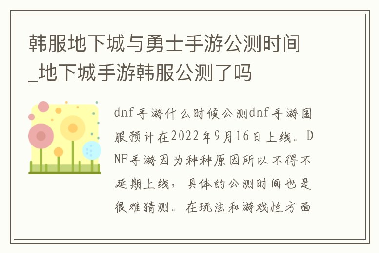 《dnf》手游國服上線時間是2023年9月16日。號稱“八百萬勇士”的國服老玩家仍然對手游的上線翹首以盼。在國服官博,盡管自兩年前宣布進行延期后就再無發展更新,但如今幾乎每天都有玩家在兩年前的延期公告下評論,希望游戲能。