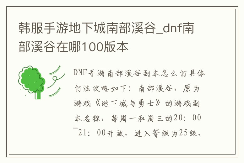 韓服手游地下城南部溪谷_dnf南部溪谷在哪100版本