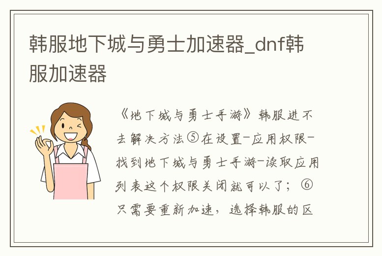 ⑤在設置-應用權限-找到地下城與勇士手游-讀取應用列表這個權限關閉就可以了;⑥只需要重新加速,選擇韓服的區服進行加速就可以解決;⑦換加速器,推薦網易UU或者是Tap加速器,手機上最后只保留一個可以解決這個問題的加速器;