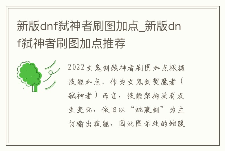 那么90級版本的劍魔該怎么加點呢?下面小編就為大家帶來90級版本劍魔刷圖加點,一起來看看吧。90版本劍魔刷圖加點:女鬼劍士>契魔者>劍魔>弒神者這里放棄了小技能,因為小技能釋放時間較長,傷害也不是很高。