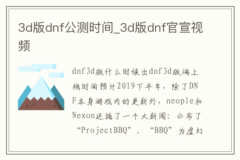 dnf3d版端上線時間預計2019下半年,除了DNF本身游戲內的更新外,neople和Nexon還搞了一個大新聞:公布了“Project BBQ”。“BBQ”為虛幻4引擎打造的大型3D多人聯網RPG,不出預料的話會基于原版《地下城與勇士》開發。最低配。