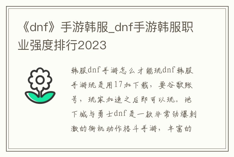 韓服dnf手游怎么才能玩dnf韓服手游玩是用17加下載,要谷歌賬號,玩家加速之后即可以玩。地下城與勇士dnf是一款非常勁爆刺激的街機動作格斗手游,豐富的任務系統,自由挑戰任性pk,多種模式的戰斗歷險為你打造最酷炫的英雄之戰。實力對決火爆勁戰,無。1、下載韓服手游dnf要錢嗎不要錢的。韓服手游dnf一般指地下城與勇士。《地下城與勇士》(DungeonFighter,簡稱DNF)是由韓國(Neopl