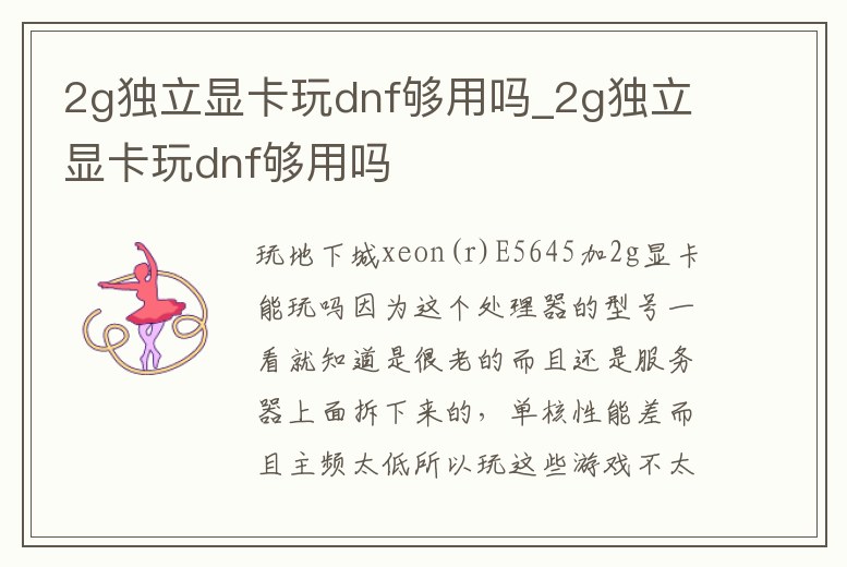 玩地下城xeon(r)E5645加2g顯卡能玩嗎因?yàn)檫@個(gè)處理器的型號(hào)一看就知道是很老的而且還是服務(wù)器上面拆下來(lái)的,單核性能差而且主頻太低所以玩這些游戲不太行,獨(dú)立顯卡你沒說型號(hào)是什么樣的,顯存2g還是其他多少容量并