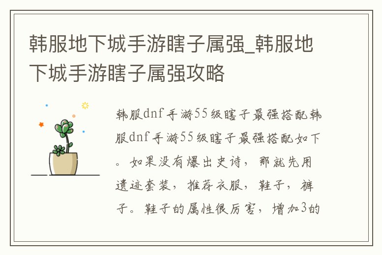 韓服dnf手游55級瞎子最強搭配如下。如果沒有爆出史詩,那就先用遺跡套裝,推薦衣服,鞋子,褲子。鞋子的屬性很厲害,增加3的雙攻。遺物套裝可以通過升級獲得套裝效果,傷害提升3。腰帶選擇PK場7000積分換的戰神。