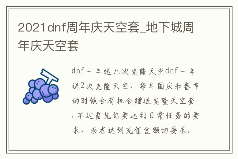 dnf一年送幾次克隆天空dnf一年送2次克隆天空,每年國慶和春節的時候會有機會贈送克隆天空套.不過首先你要達到日常任務的要求,或者達到充值金額的要求。克隆天空可以合成透明天空。但是也有失敗的幾率。如果有不清楚或有一半地方可以咨詢游戲客服,你可。1、DNF第13期天空曝光,33.86%玩家表示無愛,你會如何選擇【3】最終建議由于春節