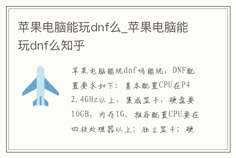 能玩,DNF配置要求如下:基本配置CPU在P4 2.4GHz以上,集成顯卡,硬盤要10GB,內(nèi)存1G。推薦配置CPU要在四核處理器以上;獨(dú)立顯卡;硬盤要10GB以上,內(nèi)存4G。如果電腦滿足這些要求的話是可以玩的,蘋果電腦玩DNF,Mac系統(tǒng)玩。