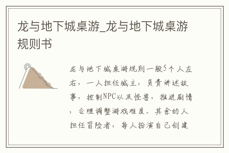 龍與地下城是一個多人桌面角色扮演游戲,一般一個人做主持人,其他人分別扮演角色,依靠各種多面骰子進行游戲,基本過程是玩家扮演的冒險者在一個虛擬的世界進行冒險,可以做想做的任何事情,具體情況在規則書上面有說明,根據。
