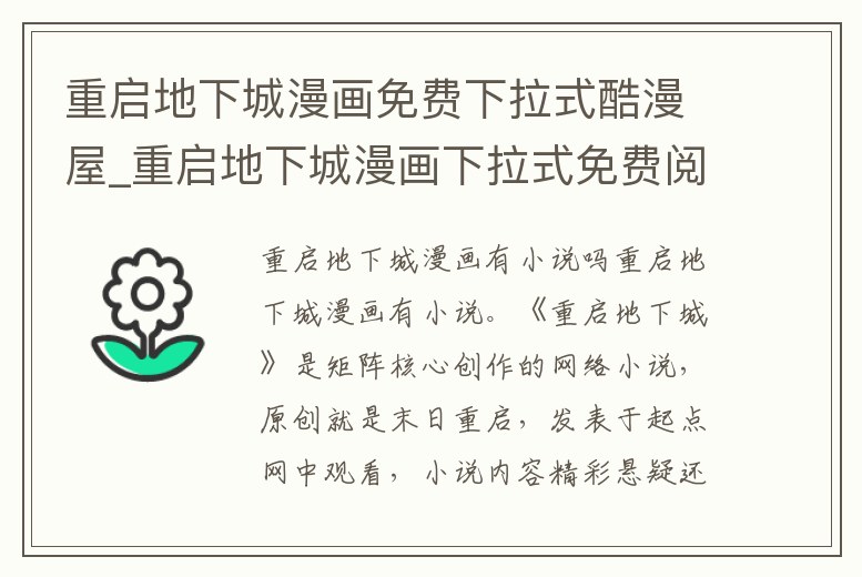 末日重啟。《重啟地下城》是矩陣核心創作的網絡小說,原創就是末日重啟,發表于起點網中觀看,小說內容精彩懸疑還刺激,在網上特別受閱讀者的喜歡和認可。