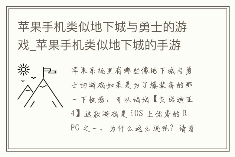如果是為了爆裝備的那一下快感,可以試試【艾諾迪亞4】這款游戲是 iOS 上優秀的 RPG 之一,為什么這么說呢?請看以下幾點:1.龐大的裝備系統 這款游戲跟暗黑破壞神系列游戲一樣,裝備有顏色之分:白色為普通裝備,綠色和。