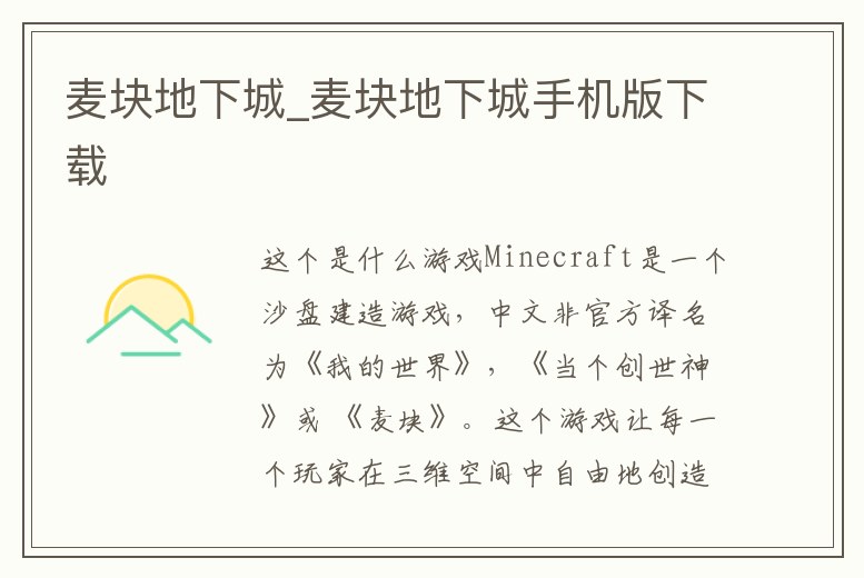 《我的世界》是一款3D第一人稱沙盒游戲。玩家可以在三維空間中自由地創造和破壞不同種類的方塊,用想象力建立并探索一個專屬于玩家的世界。游戲畫風獨特,主打積木馬賽克風。游戲里玩家可以在單人或多人模式中通過摧毀或創造方。