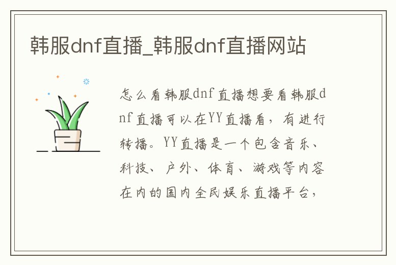 想要看韓服dnf直播可以在YY直播看,有進行轉播。YY直播是一個包含音樂、科技、戶外、體育、游戲等內容在內的國內全民娛樂直播平臺,移動端月活躍用戶超4100萬,簽約星級主播超150萬 。其最早建立在一款強大的富集通訊工具——。