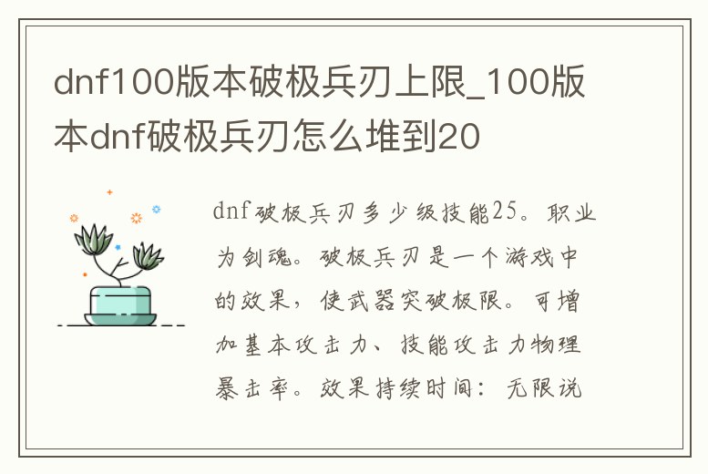 問題三:現版本破極兵刃極限能堆到多少級 滿級就20,時裝+1,千年+2,天界戒指+1,神圣控魂套+2,2013稱號如果弄出2J又是2,最高28J。問題四:dnf85版本破極兵刃能堆到多少級 滿級就20,時裝+1,千年+2,天界。