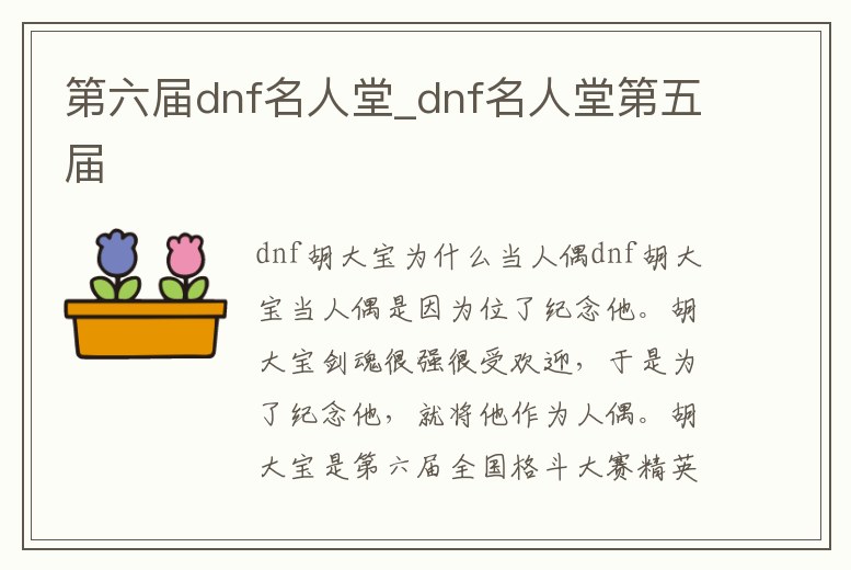 dnf胡大寶當(dāng)人偶是因?yàn)槲涣思o(jì)念他。胡大寶劍魂很強(qiáng)很受歡迎,于是為了紀(jì)念他,就將他作為人偶。胡大寶是第六屆全國格斗大賽精英賽個(gè)人季軍、2013年第三屆F1天王賽八強(qiáng),他很強(qiáng)很受歡迎,于是為了紀(jì)念他,就將他作為人偶。