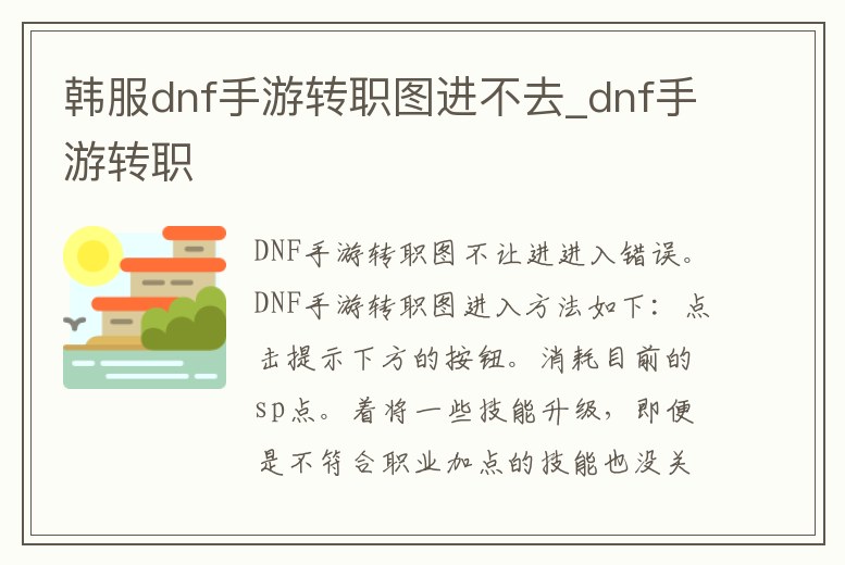 進入錯誤。DNF手游轉職圖進入方法如下:點擊提示下方的按鈕。消耗目前的sp點。著將一些技能升級,即便是不符合職業加點的技能也沒關系。第一次出現這種情況一般是轉職之后,去天空之城時遇到的,剩余sp點不能。