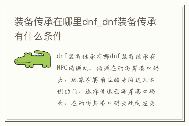 選擇角色進入游戲,移動到【西海岸港口】。點擊【諾頓】NPC,點擊【裝備繼承】。放入需要繼承與被繼承的裝備,準備材料后點擊【能力繼承】。dnf裝備繼承方法說明:選擇角色進入游戲,移動到【西海岸港口】。點擊。