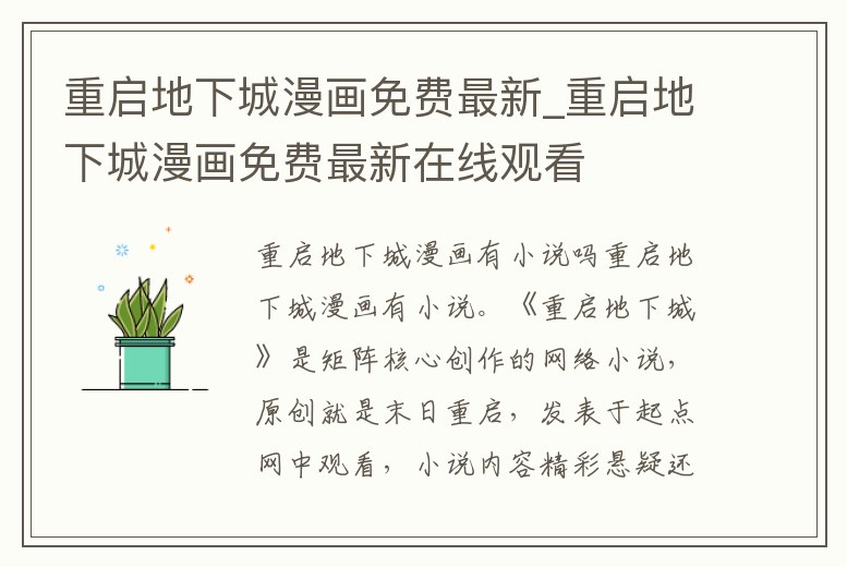 重啟地下城漫畫有小說。《重啟地下城》是矩陣核心創作的網絡小說,原創就是末日重啟,發表于起點網中觀看,小說內容精彩懸疑還刺激,在網上特別受閱讀者的喜歡和認可。
