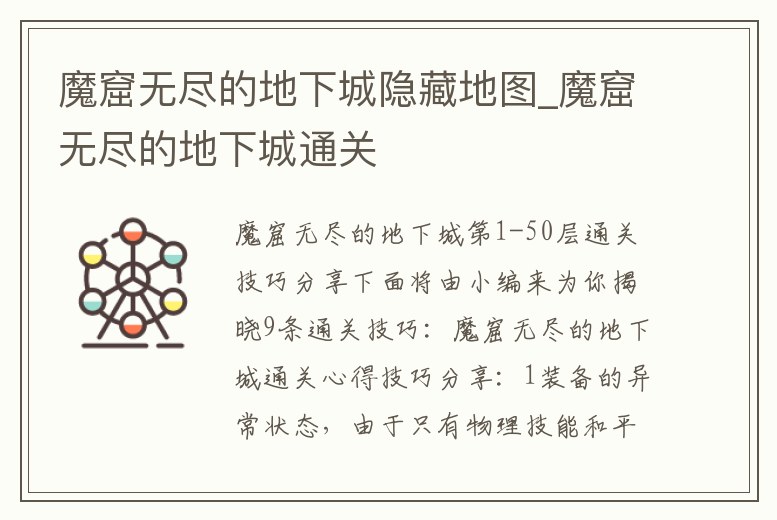 下面將由小編來為你揭曉9條通關技巧:魔窟無盡的地下城通關心得技巧分享:1裝備的異常狀態,由于只有物理技能和平砍能附加,所以是由物理職業來穿2盜賊的高速度+裝備提供的100%+封魔,可以讓所有BOSS以及BOSS左右的惡心小怪變。