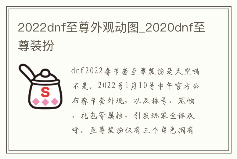 不是。2022號1月10號中午官方公布春節套外觀,以及稱號、寵物、禮包等屬性,引發玩家全體歡呼。至尊裝扮僅有三個角色擁有,鬼劍士、黑暗武士以及女鬼劍。外觀霸氣上檔次比神器天空還要獨特,背后的特效是時空轉輪,創意感拉滿。