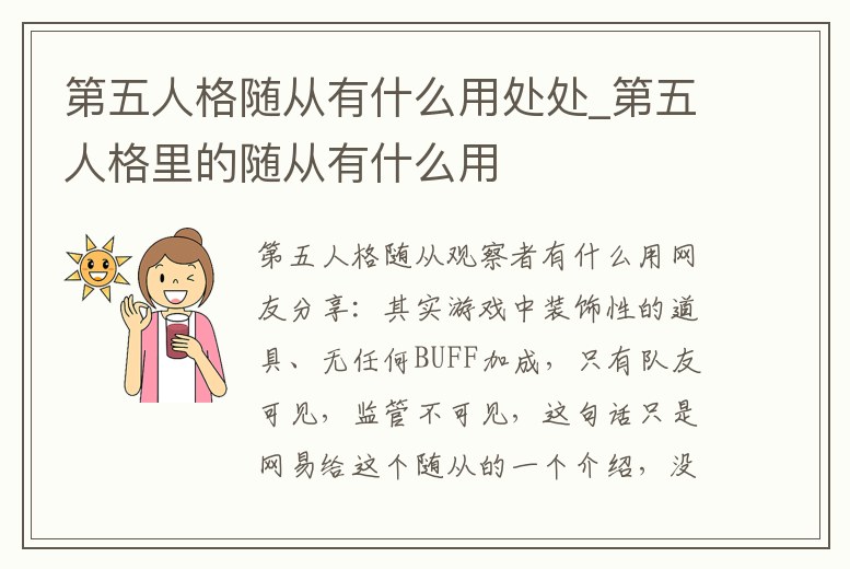 網友分享:其實游戲中裝飾性的道具、無任何BUFF加成,只有隊友可見,監管不可見,這句話只是網易給這個隨從的一個介紹,沒有任何明顯或者暗示的功能哦~部分普通隨從沒有介紹語,介紹語可以算是觀察者這種稀有隨從的專屬哦~。