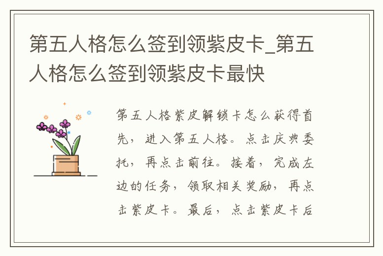 《第五人格》可以通過(guò)參加新春活動(dòng)來(lái)獲得紫皮卡。3天紫皮體驗(yàn)卡:一般來(lái)說(shuō),安卓手機(jī)福利真的是特別的好。特別是華為和vivo手機(jī),偶爾系統(tǒng)就會(huì)不定時(shí)的出福利,不定時(shí)就會(huì)出一些3天紫皮卡之類的。永久紫皮卡:一般來(lái)說(shuō),如果。