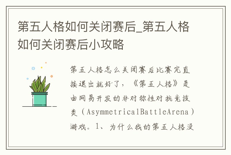 第五人格怎么關(guān)閉賽后比賽完直接退出就好了,《第五人格》是由網(wǎng)易開發(fā)的非對稱性對抗競技類(AsymmetricalBattleArena)游戲。1、為什么我的第五人格沒有賽后在設(shè)置里找到社交,然后往下拉找到關(guān)閉賽后那個,把它關(guān)了。2、第五人格晉級賽提示怎么關(guān)第五人格晉級賽提示怎么