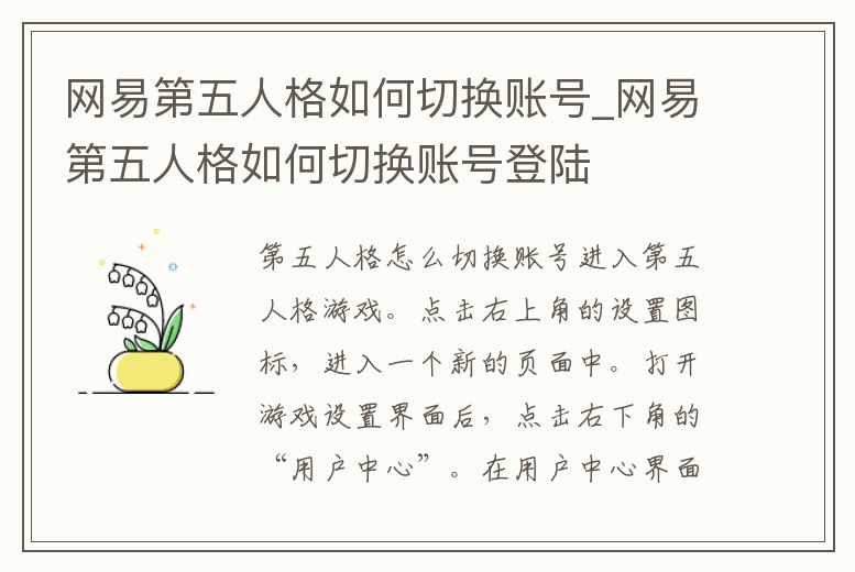 第五人格切換賬號方法如下:在游戲主界面找到右上角齒輪狀的圖標,然后在設置頁面中點擊右下角的用戶中心,這樣就可以進入用戶的詳細頁面。在用戶中心中點擊右側的切換賬號,并在登錄欄下方點擊其他賬號登錄即可切換至其。