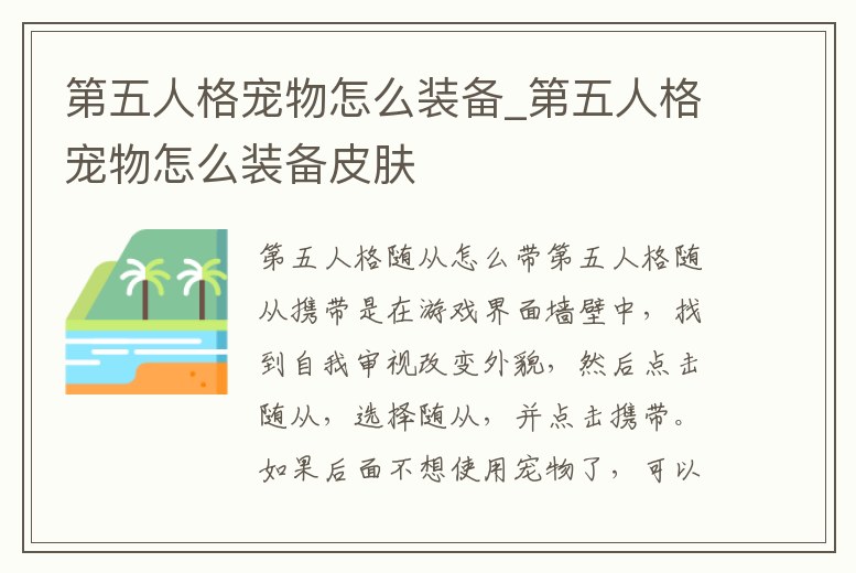 第五人格隨從怎么帶第五人格隨從攜帶是在游戲界面墻壁中,找到自我審視改變外貌,然后點擊隨從,選擇隨從,并點擊攜帶。如果后面不想使用寵物了,可以到此頁面點擊卸下。攜帶寵物,在玩游戲的時候,就會有一個寵物飛在自己的頭上,站立不動的時候。1、第五人格新手玩法攻略新手實用技巧匯總在大廳中,偵探可以在房間走開走去的界面,找到鏡子可以裝備寵物[經常有人問寵物怎么裝備在游戲中,[別人可以做出各種動作]