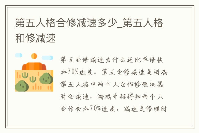 加70%速度。第五合修減速是游戲第五人格中兩個人合作修理機器時會減速,游戲介紹得知兩個人合作會加70%速度,減速是修理時就會減的,平均到兩個人就會比單人修更快。是由網易開發的非對稱性對抗競技類手機游戲,游戲于201。