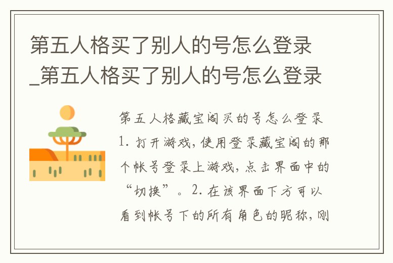 1.打開游戲,使用登錄藏寶閣的那個帳號登錄上游戲,點擊界面中的“切換”。2.在該界面下方可以看到帳號下的所有角色的昵稱,剛購買的帳號也會顯示在下方,選擇點擊購買的帳號。3.點擊“進入游戲”按鈕。4.進入游戲成功,就說明已。