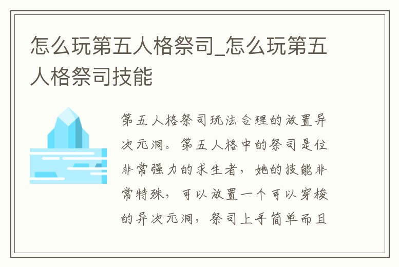 第五人格祭司玩法合理的放置異次元洞。第五人格中的祭司是位非常強力的求生者,她的技能非常特殊,可以放置一個可以穿梭的異次元洞,祭司上手簡單而且玩好了會非常的秀,往往在高分段一個洞就能左右戰局的勝負。祭司的隱藏成就異位坍縮是根據監。1、第五人格祭司怎么玩祭司加點玩法教程攻略單人天賦推薦(自保為上):破窗理論+回光返照+分心+絕處逢生+不屈不撓+愈合推薦理由:由于單排缺乏配合