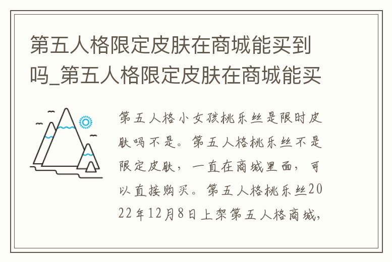 不是。第五人格桃樂絲不是限定皮膚,一直在商城里面,可以直接購買。第五人格桃樂絲2022年12月8日上架第五人格商城,是一款常駐皮膚,玩家可以用碎片兌換,是不會下架的,并不是限定皮膚。