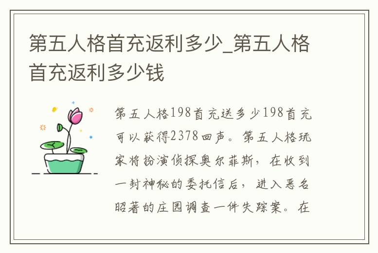 198首充可以獲得2378回聲。第五人格玩家將扮演偵探奧爾菲斯,在收到一封神秘的委托信后,進入惡名昭著的莊園調查一件失蹤案。在進行證據調查過程中,玩家扮演的奧爾菲斯將采用演繹法,對案情進行回顧。在案情回顧時,玩家可以選。