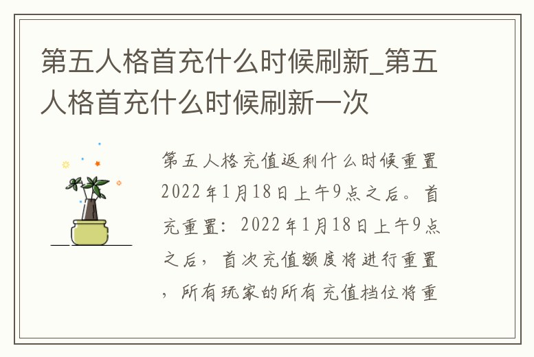 2022年1月18日上午9點之后。首充重置:2022年1月18日上午9點之后,首次充值額度將進行重置,所有玩家的所有充值檔位將重新擁有一次享受首次充值獎勵額度的機會。活動時間:1月18日9:00:00后。