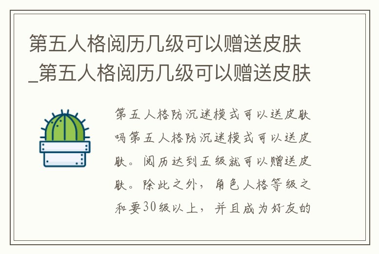 第五人格防沉迷模式可以送皮膚。閱歷達到五級就可以贈送皮膚。除此之外,角色人格等級之和要30級以上,并且成為好友的游戲時間要達到24小時。只能使用回聲來贈送禮物。
