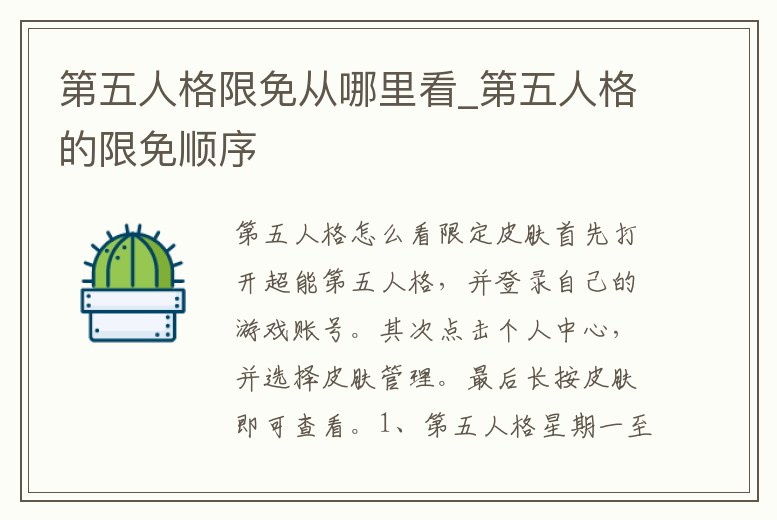 第五皮膚限免是有規(guī)律的,2022第五皮膚限免規(guī)律如下:>星期一限免冒險家、先知,星期二限免魔術(shù)師、入儉師,星期三限免前鋒、舞女,星期四限免盲女,星期五機械師,星期六限免調(diào)香師和傭兵,星期天限免空軍和祭司。