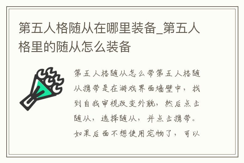 第五人格隨從攜帶是在游戲界面墻壁中,找到自我審視改變外貌,然后點擊隨從,選擇隨從,并點擊攜帶。如果后面不想使用寵物了,可以到此頁面點擊卸下。攜帶寵物,在玩游戲的時候,就會有一個寵物飛在自己的頭上,站立不動的時候。