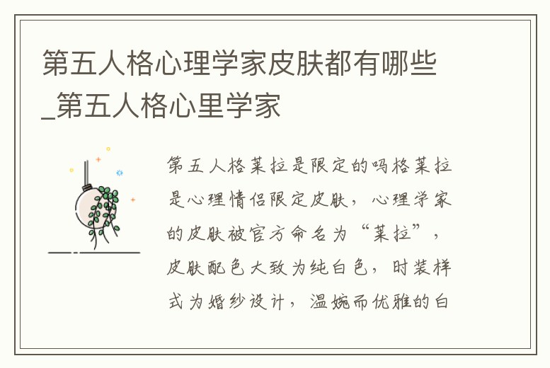 格萊拉是心理情侶限定皮膚,心理學家的皮膚被官方命名為“萊拉”,皮膚配色大致為純白色,時裝樣式為婚紗設計,溫婉而優雅的白色婚紗長裙非常得體,妝容精致,像是即將步入婚姻殿堂的待嫁新娘 。