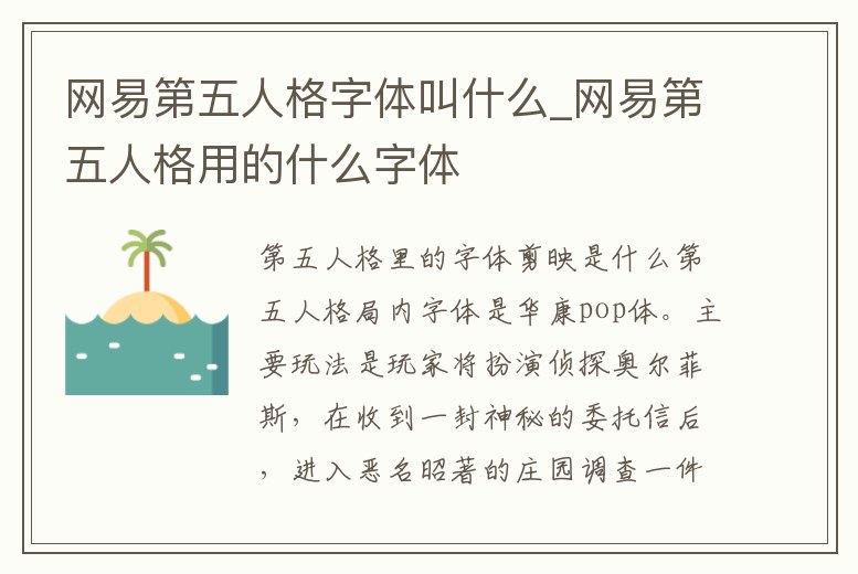 第五人格局內字體是華康pop體。主要玩法是玩家將扮演偵探奧爾菲斯,在收到一封神秘的委托信后,進入惡名昭著的莊園調查一件失蹤案。在進行證據調查過程中,玩家扮演的奧爾菲斯將采用演繹法,對案情進行回顧。在案情回顧時,玩。