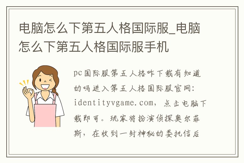 進入第五人格國際服官網(wǎng):identityvgame.com,點擊電腦下載即可。玩家將扮演偵探奧爾菲斯,在收到一封神秘的委托信后,進入惡名昭著的莊園調(diào)查一件失蹤案。在進行證據(jù)調(diào)查過程中,玩家扮演的奧爾菲斯將采用演繹法,對案情進行回顧。