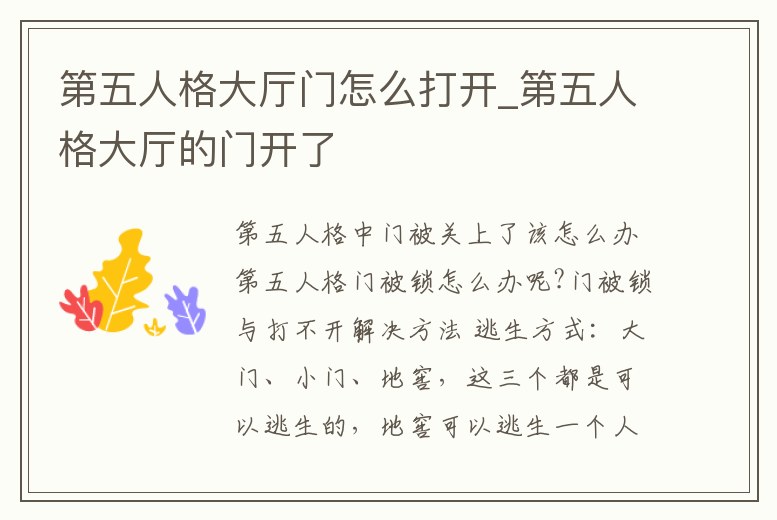第五人格門被鎖怎么辦呢?門被鎖與打不開解決方法 逃生方式:大門、小門、地窖,這三個都是可以逃生的,地窖可以逃生一個人,大門可以全部逃生,小門也可以逃生。逃生需要觸發條件,開啟大門、小門、地窖,這樣我們才可以逃。