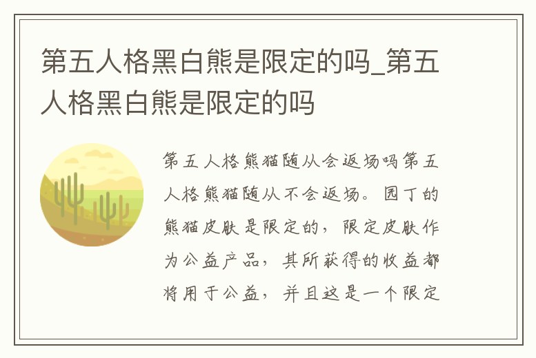 第五人格熊貓隨從不會返場。園丁的熊貓皮膚是限定的,限定皮膚作為公益產品,其所獲得的收益都將用于公益,并且這是一個限定皮膚,所以并不會返場。